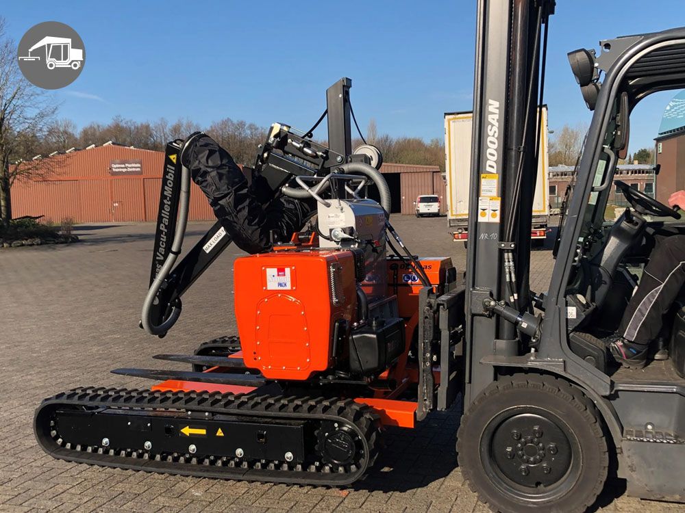 De Vacu-Pallet-Mobil E heeft een onderstel met 2 rubberen rupsbanden. Hierdoor kan hij ook op moeilijk begaanbaar terrein worden gemanoeuvreerd.